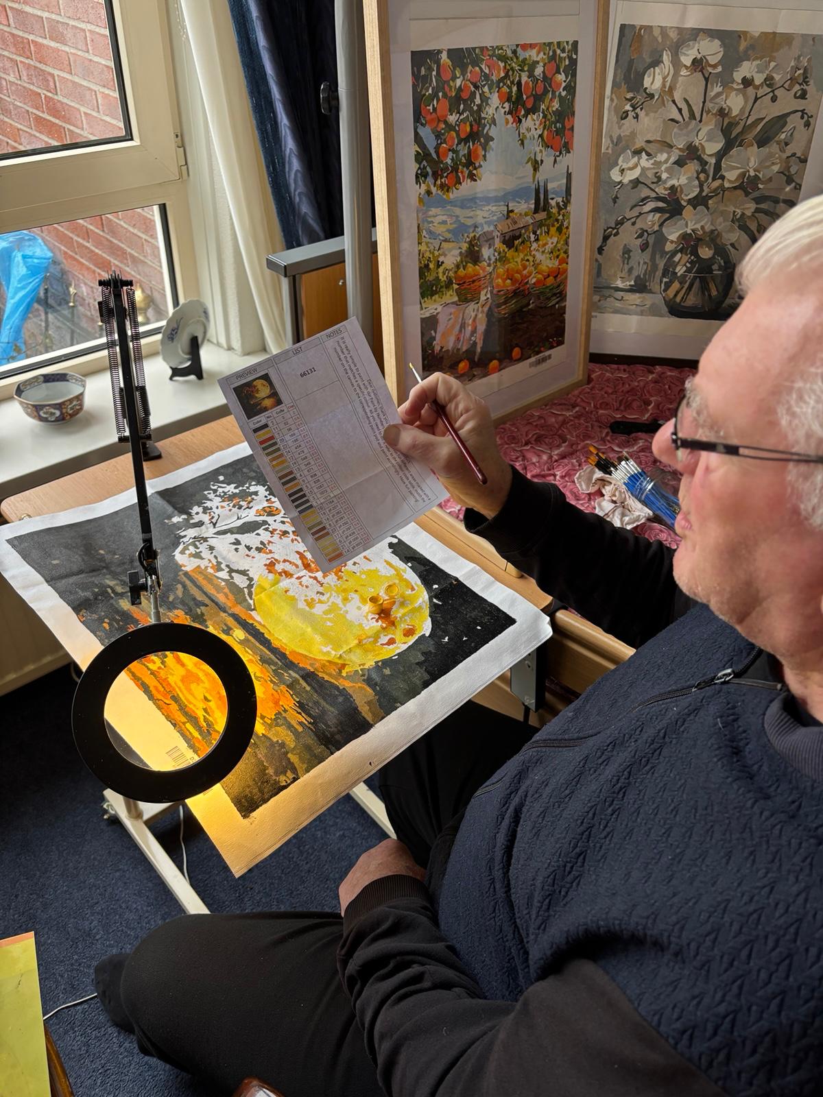 Meneer Tijsen kreeg de smaak te pakken, en voert zijn passie voor schilderen ook thuis uit. “Ik ben na mijn beroerte ook begonnen met het maken van kunst. Ik krijg wel een beetje hulp, want ik schilder met van die cijfertjes”, vertelt hij. Zijn vrouw haakt in: “Dat is soms behoorlijk priegelwerk, maar dat lukt hem toch maar mooi. We zijn echt zo blij dat hij dit soort dingen nog kan en er ook van geniet”, vertelt zij liefdevol.