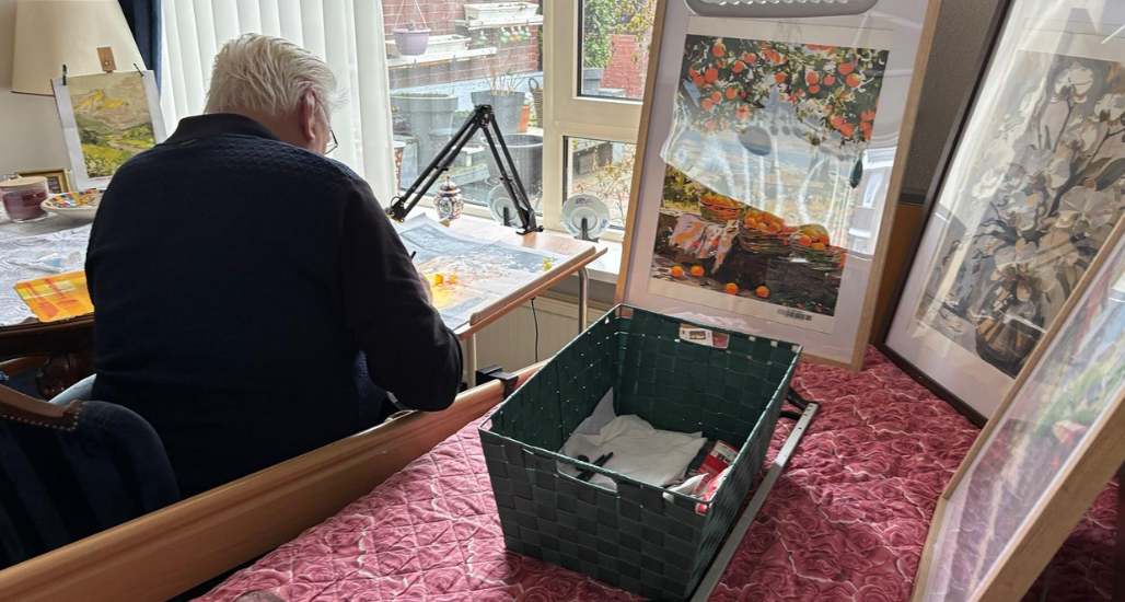 Daarnaast gaat meneer sindsdien twee keer per week naar de dagbesteding op zorglocatie Den Koogh in Den Helder. Na bijna zeven jaar wekelijks de dagbesteding te bezoeken, heeft meneer het nog altijd naar zijn zin. “Ik vind het heerlijk om bezig te zijn. We zijn er altijd in de weer met van alles en nog wat. Er is zoveel te doen, van samen bewegen tot schilderen, en van gewoon rustig de krant lezen tot gezellig kletsen met elkaar. Er is voor ieder wat wils!”, vertelt hij enthousiast. “Maar we beginnen de dag steevast met een kop koffie. Daarna gaan we aan de slag.”